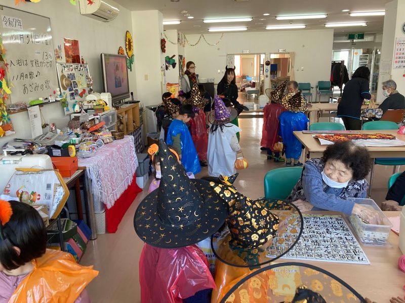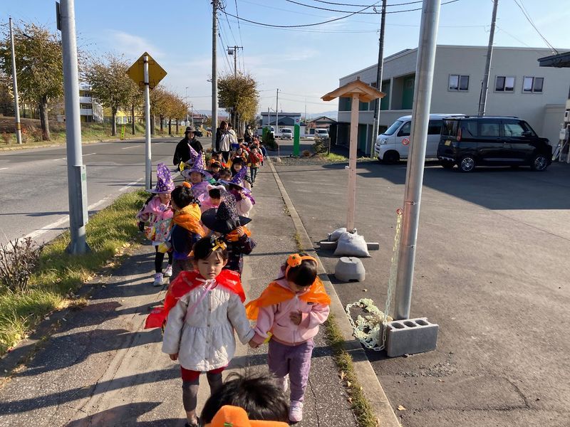 楽しみにしていたハロウィンの日!マントやカバンなど、自分達で作った衣装を身にまとい、地域を練り歩きました。