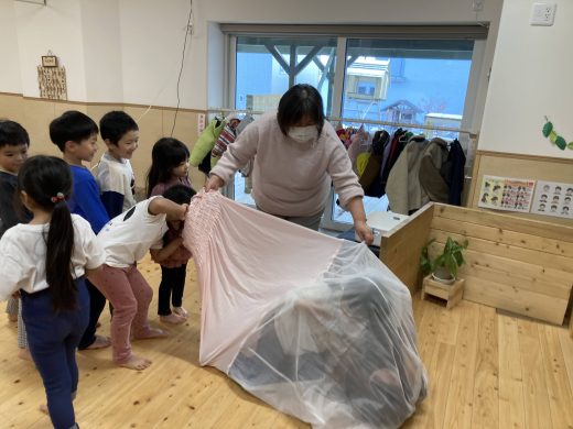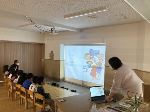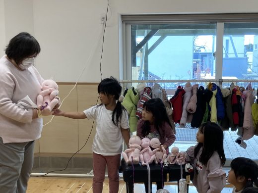 上川助産院の上川晶恵さん、オホーツク助産師ネットワークの松崎聡美さん、近藤助産院の近藤真珠美さんが来園して、5歳児対象の性教育を行ってくれました。6月に続き第2回目の開催となった今回は、いのちの誕生についてお話してもらいました。また子宮の中に入ってみよう体験や、月齢で大きさの異なる胎児の人形の抱っこ体験もしました。